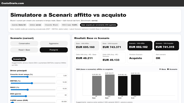 L’applicazione dedicata al confronto tra affitto e acquisto nasce proprio per colmare questo vuoto. Non si limita a confrontare un canone con un prezzo, ma costruisce un’analisi finanziaria fondata sui flussi di cassa, attualizzati al costo del capitale. È uno strumento che consente al professionista di spostare il confronto dal piano emotivo al piano economico-finanziario.