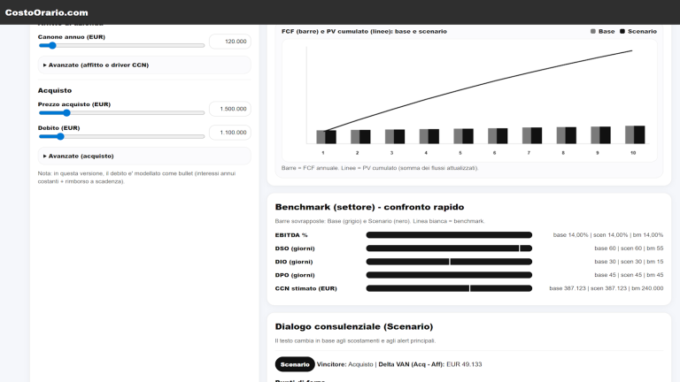 Durante il primo incontro con il cliente, inserendo pochi dati essenziali si ottiene una fotografia immediata della convenienza finanziaria delle due alternative. Questo consente di orientare subito la discussione su basi quantitative.
