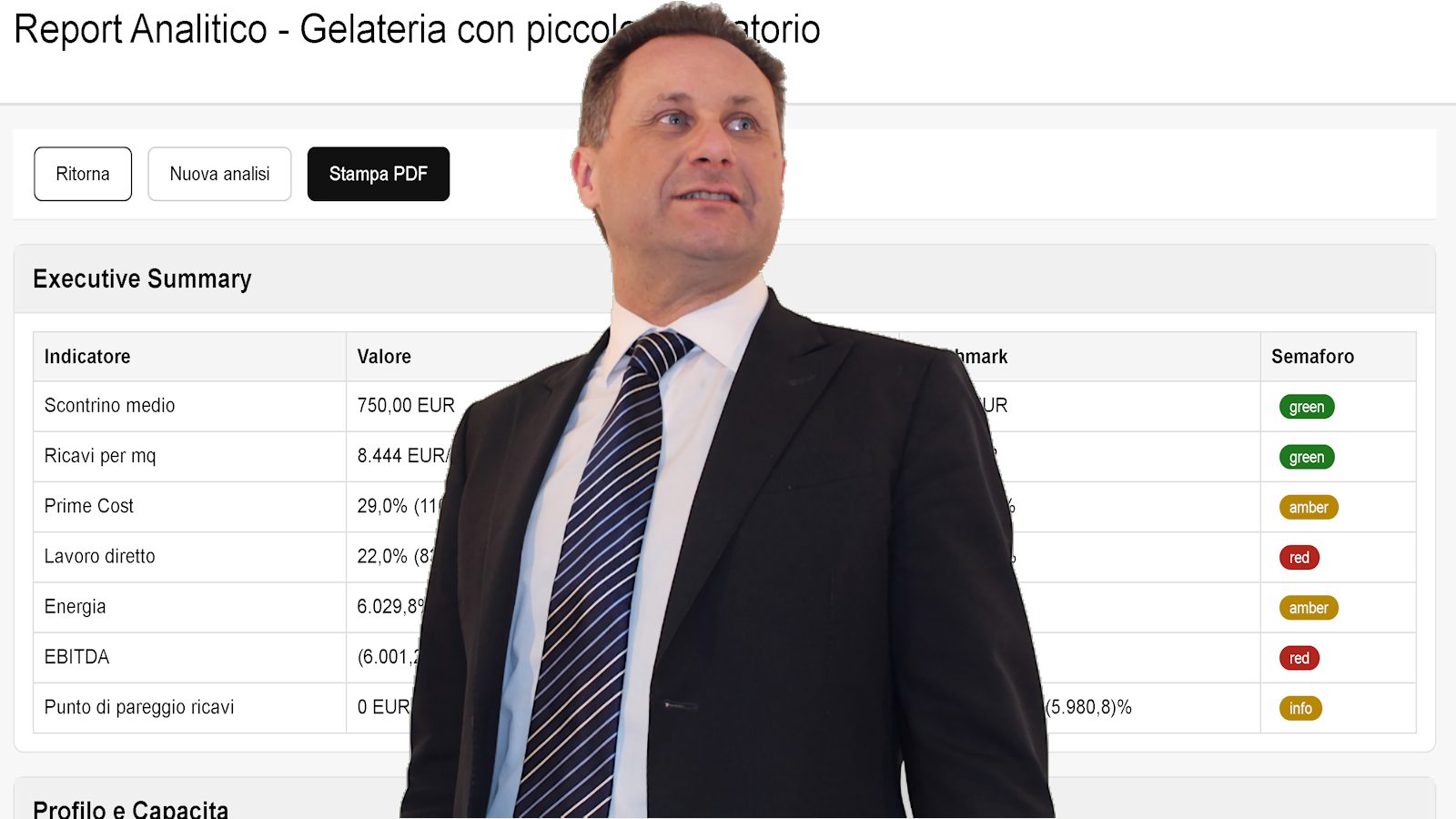 Il sistema elabora tutto in tempo reale e produce un report professionale con semafori, grafici e note di lettura.
