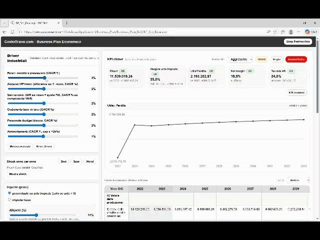 Prendiamo come esempio una pagina di Business Plan Economico costruita per lavorare in tempo reale sul conto economico. Il professionista può intervenire sui driver più rilevanti, come crescita dei ricavi, incidenza degli acquisti, servizi, costo del personale, ammortamenti, fiscalità e scenari di shock anno per anno. In pochi minuti può mostrare al cliente tre assetti molto diversi:
