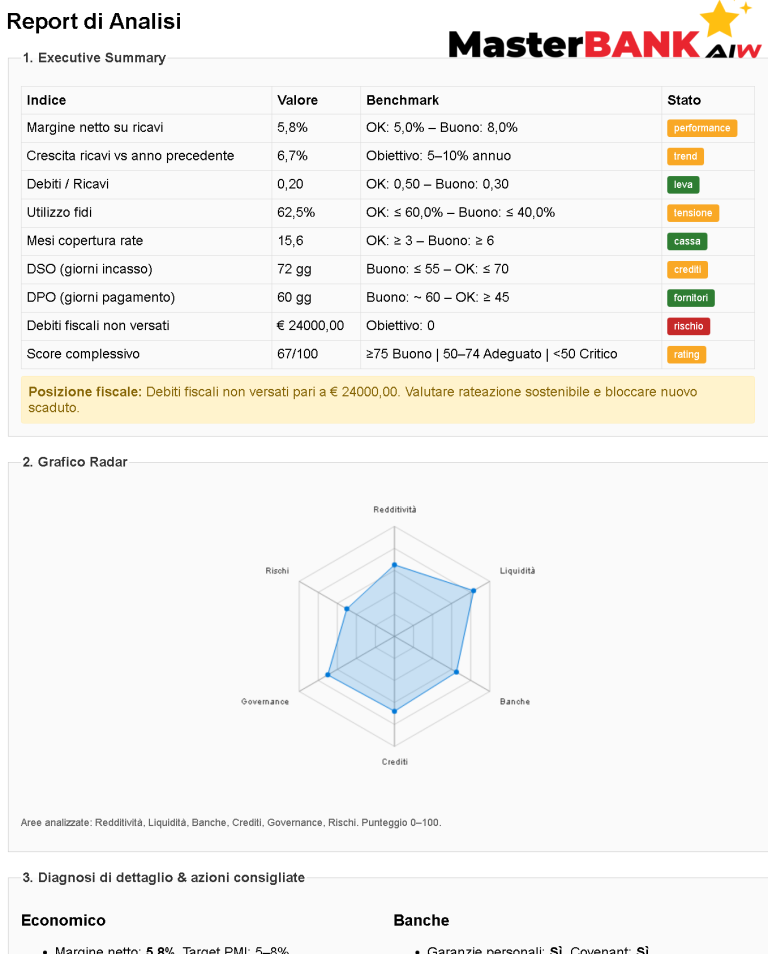 In pochi minuti raccoglie dati chiave dell’azienda — vendite, utile, debiti, liquidità, scadenze, rapporti bancari, posizione fiscale, concentrazione clienti, governance — e restituisce: