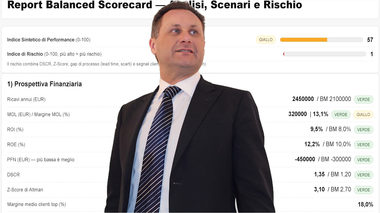 In pochi minuti, l’applicazione elabora i dati, li confronta con benchmark di settore e genera una Balanced Scorecard personalizzata, pronta per essere discussa insieme.
