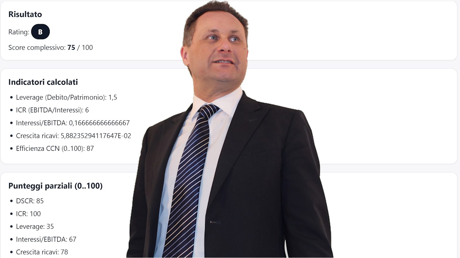 in 5–10 minuti inserisci pochi dati e ottieni un rating “stile banca” che il cliente non ha mai visto dal suo precedente Commercialista.