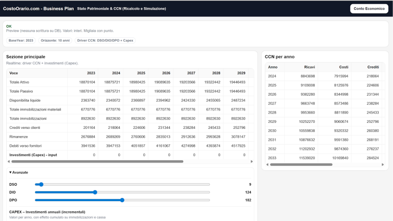 Nel lavoro consulenziale evoluto, il valore non sta più solo nel “costruire” un Conto Economico previsionale, ma nel mostrare in modo immediato le conseguenze delle scelte gestionali su Stato Patrimoniale e Rendiconto Finanziario. È esattamente ciò che rende particolarmente interessante la demo del Business Plan Economico Realtime disponibile su CostoOrario.com.