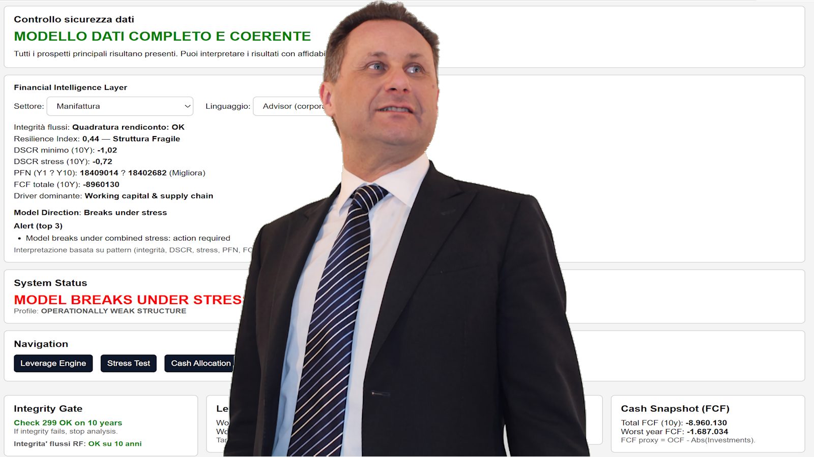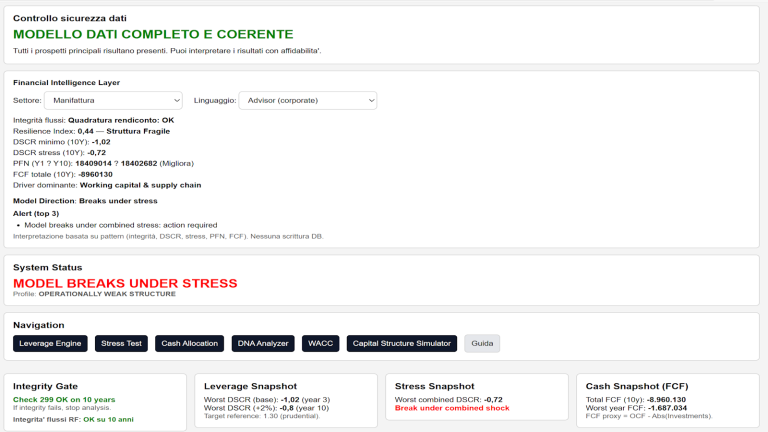 Ma se sotto stress il DSCR scende sotto 1 e la PFN cresce progressivamente, il sistema segnala una fragilità strutturale che un’analisi tradizionale potrebbe non evidenziare.