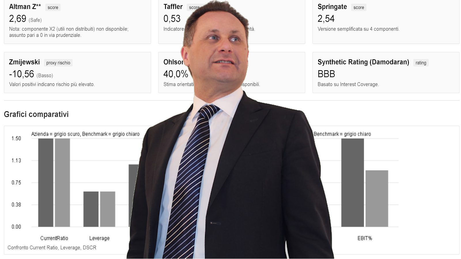 Altman Z-Score e Z** – misura la probabilità di insolvenza combinando redditività, leva finanziaria e solidità patrimoniale.